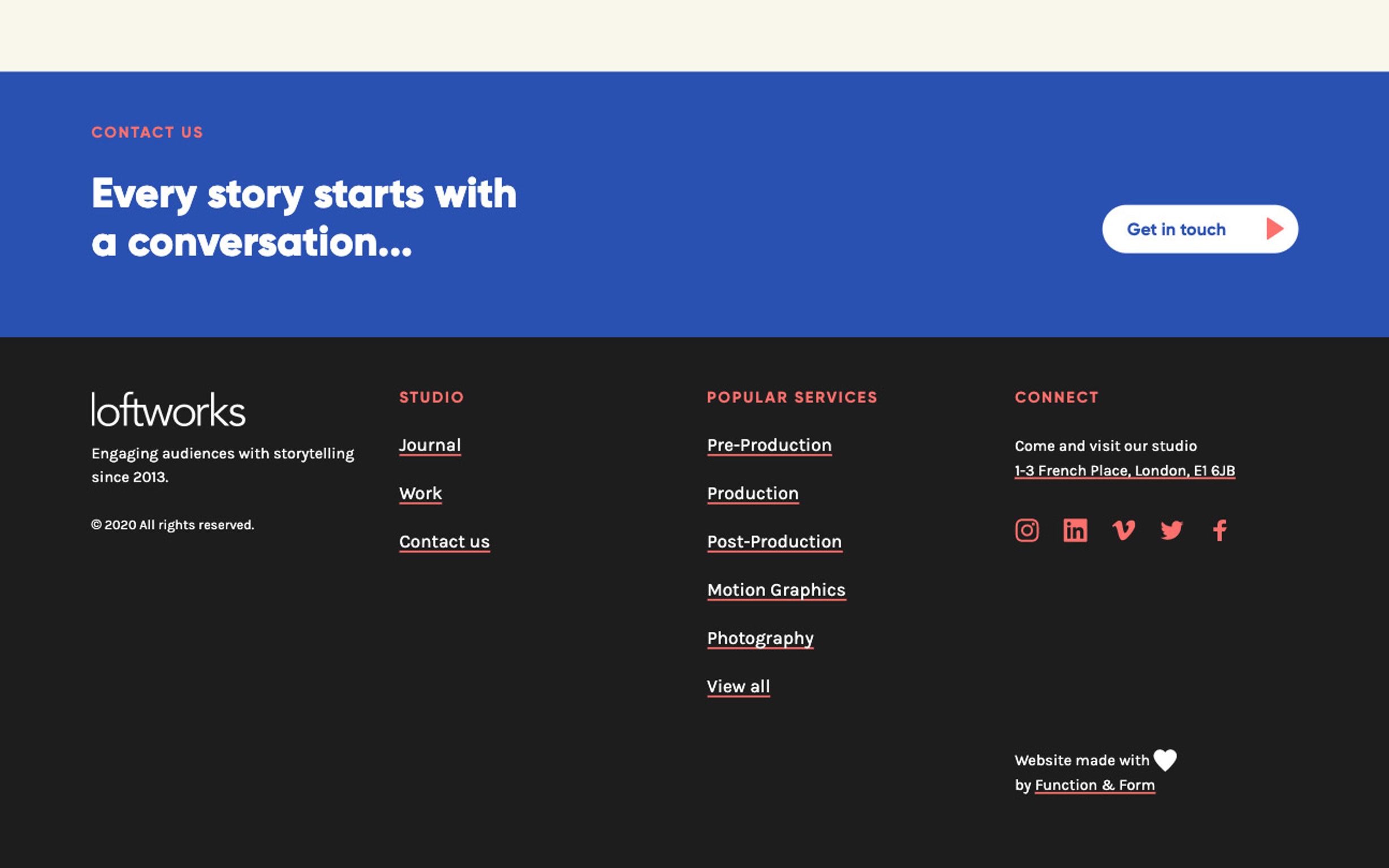 Function & Form did an exceptional job designing and building our video production website. They took time to get to know us, our service offering and tailored a beautifully designed website that is easy to navigate and speaks directly to our potential customers. The fact that we ended up partnering with them to widen the service offering to our clients speaks volumes.Marc Trojanowski – Director at Loftworks™
